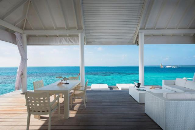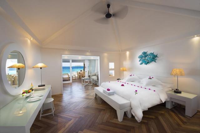 terasa (zariadená) Ostatné typy izieb (ak nie je uvedené inak, všetky izby majú vyššie uvedené vybavenie) Beach Front Junior Suite: 51-60 m2, vizuálne oddelená obývacia izba/spálňa Vodná vila: 51-60 m2, samostatná vila, vodná vila, priamy prístup k oceánu Jacuzzi Water Villa: 51-60 m2, samostatná vila, vodná vila, priamy prístup k oceánu, jacuzzi |
