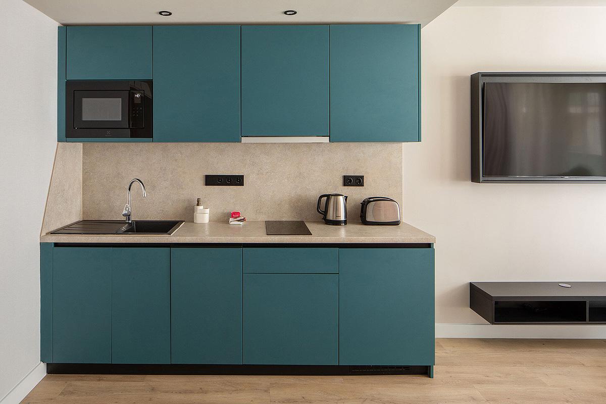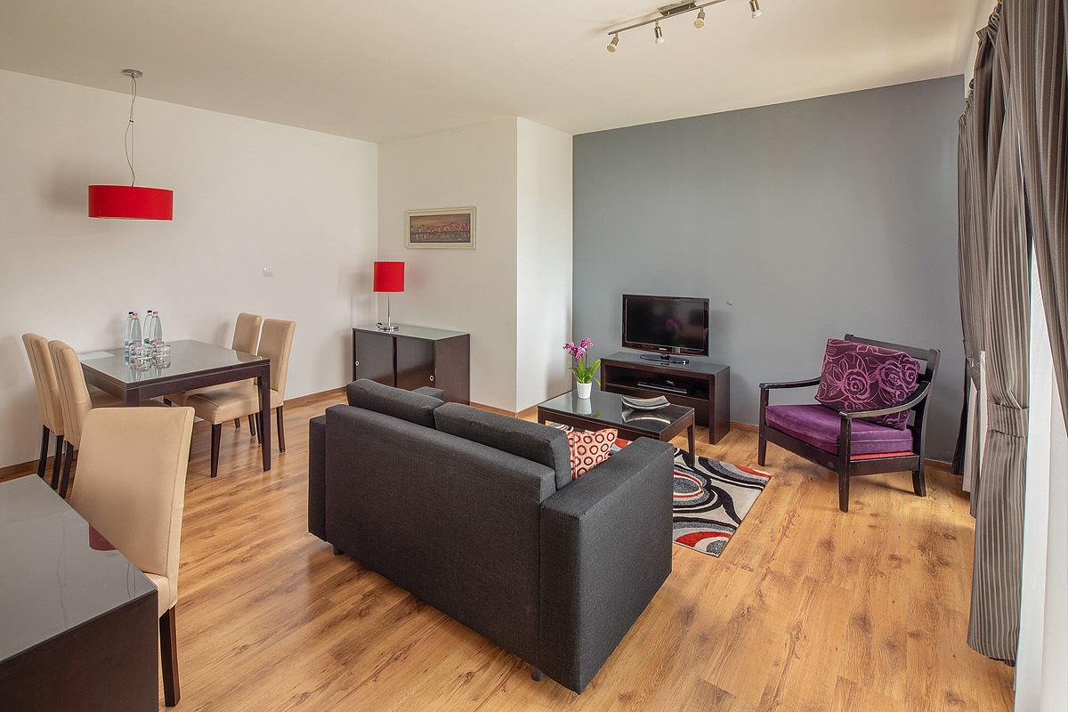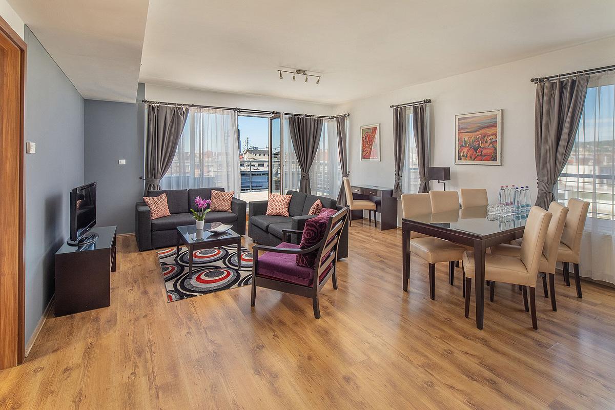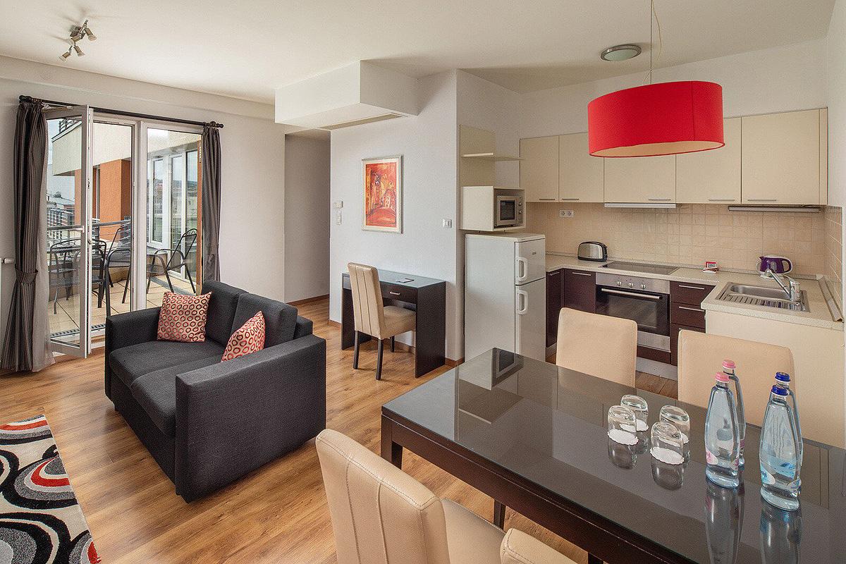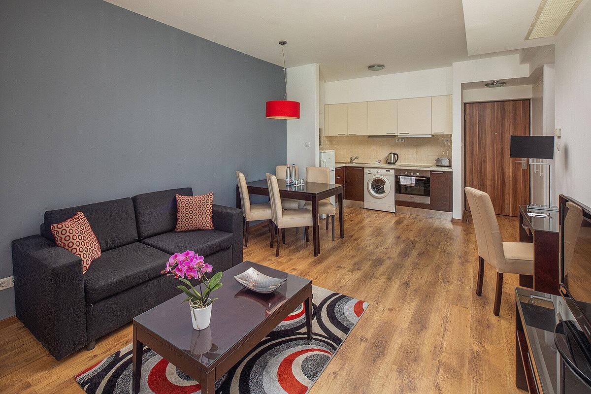 zariadenie; maximálna obsadenosť 2 dospelé osoby #Deluxe Suite 3: 45 m² - obytná miestnosť s kuchynským kútom a rozkladacou pohovkou pre 3. dospelú osobu, 1 spálňa s manželskou posteľou (180×200 cm) a spoločnou prikrývkou, sociálne zariadenie; maximálna obsadenosť 3 dospelé osoby #Executive Suite 5: 75 m² - obytná miestnosť s kuchynským kútom a rozkladacou pohovkou pre 5. dospelú osobu, 2 spálne s manželskou posteľou (180×200 cm) a spoločnou prikrývkou, sociálne zariadenie; maximálna obsadenosť 5 dospelých osôb |