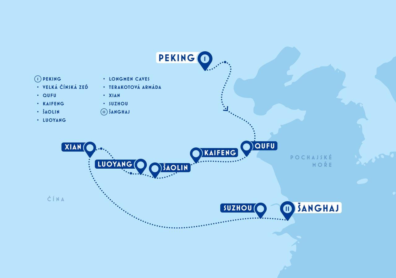 Šanghaji. 2. den: Přílet do metropole Číny - Pekingu. Chrám nebes - vrcholné dílo dynastie Ming dokončené roku 1420 - místo setkávání nebe a země. Za návštěvu stojí např. Síň modliteb, Zeď ozvěn nebo Oltář Nebes. Večeře, transfer do hotelu, ubytování, nocleh. 3. den: Snídaně. Celodenní prohlídka města zahrnující náměstí Nebeského klidu, ze kterého volně projdeme do Zakázaného města - tradičního sídla čínských panovníků. Procházka do Beihai Parku - bývalé císařské zahrady vystavěné v 11.st., rozloha 69 hektarů s jezerem a ostrovem Jade Flower Island, v jehož středu se tyčí 32 metrů vysoká bílá stúpa. Odpoledne návštěva Jingshan parku - zelený pahorek s výhledem na historické centrum města, Letní palác sloužící jako letní sídlo císařské rodiny, velkou plochu tvoří vodní plochy. Během své vlády zde císaři odpočívali v rozlehlých zahradách na břehu jezera. Prohlédnete si známou Loď čistoty a klidu - Mramorovou loď císařovny Cch´si z roku 1880 a projdete se nejdelším dřevěným koridorem na světě. Večeře, návrat do hotelu, nocleh. 4. den: Snídaně, poté se vydáme k jedinečnému dílu - Velké čínské zdi, která se rozpíná v neuvěřitelné délce více než 6.000 km. Následuje prohlídka hrobek Mingů (UNESCO)- podzemní krypty, kde je pohřbeno 13 ze 16 panovníků z dynastie Ming. Prohlídka nejstaršího mauzolea v Čchang-ling, kde je pohřben třetí mingský císař Jung-le (zemřel 1424), který povýšil Peking na hlavní město. Cestou zpět do Pekingu foto zastávka u národního stadionu Birdnest (Ptačí hnízdo) a Watercube (Vodní kostky) - obě stavby byly postaveny pro Letní olympijské hry v roce 2008. Návrat do hotelu, večeře, nocleh. Fakultativně možno navštívit Kungfu show. 5. den: Brzká snídaně, odjezd vlakem do Qufu (cesta cca 2 hod.) - východočínské město je rodištěm významného čínského filozofa Konfucia. Většina památek ve města je věnována právě tomuto filozofovi (říkalo se mu Mistr Kong) a jeho rodině. Nejvýznamnější památkou je Konfuciův chrám Kongmaio - jde o rozlehlý komplex chrámů, pavilonů a svatyní zapsaný na seznamu UNESCO. Dnešní podoba chrámu je z 18. st., je zde přes 500 komnat a místností a řadí se k největším dochovaným chrámům na světě. Večeře, nocleh ve městě. 6. den: Po brzké snídani přejezd vlakem (cesta cca 2,5 hod.) do Zhengzhou, transfer do starobylého opevněného města Kaifeng. Dominantou města je třinácti patrová Železná pagoda, která byla postavena roku 1049 z cihel, nikoliv ze železa, jak by napovídal její název. Kovový vzhled navozují hnědé glazované dlaždice, tak vznikl její název. Dále navštívíme chrám Xiangguo ležící v samém centru města, je jedním z největších buddhistických chrámů v Číně. Vystavěn byl již roku 555, žilo zde i tisíc mnichů, hlavní atrakcí chrámu je socha Avalókitéšvy s tisícovkou rukou a očí. Socha byla údajně vyřezávaná z kmene stromu gingko starého tisíc let, dokončení trvalo téměř 60 let. Večeře, nocleh ve městě. 7. den: Po snídani návštěva Šaolinského kláštera vystavěného roku 495 a žilo zde i 500 bojujících mnichů. Z šaolinského boxu dnes čerpají významná čínská bojová umění. Ačkoliv je chrám dnes spíše turistickou atrakcí, tradice a tajemno je tu cítit na každém kroku. Kung-fu se zde stále vyučuje, během našeho zájezdu shlédneme i krátkou show, kde místní předvedou šaolinské umění. Klášter ukrývá i mnoho historických objektů mj. Shanmen brána chrámu, síň nebeských králů, sál Mahavira, zvonice, bubnová věž a nedaleký les věží. Jedná se o hrobky významných mnichů, je jich zde přes 230 vystavěných za dynastie Tang (618-907) až po dynastii Čching (1644-1911). Odjezd do starobylého města Luoyang chráněného horami. Pro svou strategickou polohu a úrodnou zemědělskou půdu zde 105 císařů ze 13 dynastií usadilo svá hlavní města. Byly zde vytvořeny 3 ze 4 velkých čínských vynálezů - střelný prach, tisk a výroba papíru. Prohlídka města mj. - Wenfeng tower, Chrám literatury, palác Tuoling, Čtyřoká studna. Během prohlídky narazíme na místní obyvatele v tradičním čínském oděvu hanfu. Večeře, krátký večerní výlet k Nebeské bráně osvícené neonovými světly. Nocleh v hotelu. 8. den: Snídaně, následuje prohlídka nedalekých jeskyní Longmen caves. V roce 494 n. l. dynastie severní Wei přesunula svoje hlavní město z Datongu do Luoyangu a v novém působišti se se rozhodli zopakovat vybudování monumentálních jeskyní, tak jako již vytvořili jeskyně Yungang v Datongu. Na novém místě se okamžitě pustili do nového díla a v následujících 200 letech bylo v útesu nad řekou Yi vytesánno více jak 100 tisíc soch a reliéfů Buddhy (nejvyšší má přes 17 metrů). Komplex jeskyní tak tvoří vrchol sochařského buddhistického umění. Následuje přejezd vlakem do Xi´anu. prohlídka provinční metropole Xi´anu zahrnující Velkou pagodu divoké husy, opevnění města včetně městské brány a muslimský trh. Večeře, nocleh. 9. den: Po snídani návštěva Terakotové armády - jedné z nejvýznamnějších památek historické Číny - tvořené hliněnými sochami v životní velikosti určenými k rituální ochraně čínského císaře. Více než 6.000 ozbrojených bojovníků v životní velikosti je rozestavěno v bojovém šiku. Oběd, odjezd vlakem do Šanghaje, transfer na hotel, nocleh. 10. den: Po snídani prohlídka Šanghaje - staré město, Juanské zahrady - oáza zeleně přímo v centru města, kde poznáme nenapodobitelnou podobu čínských zahrad, čtvrť Tianzifang s labyrintovými uličkami je plná řemeslných obchodů, kaváren, módních studií a galerií, pokračujeme po rušn